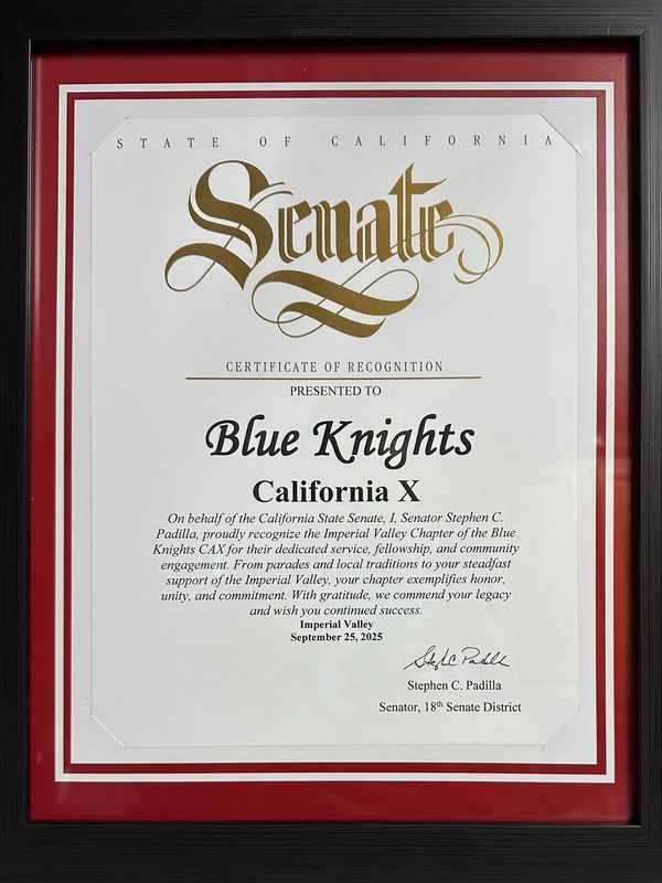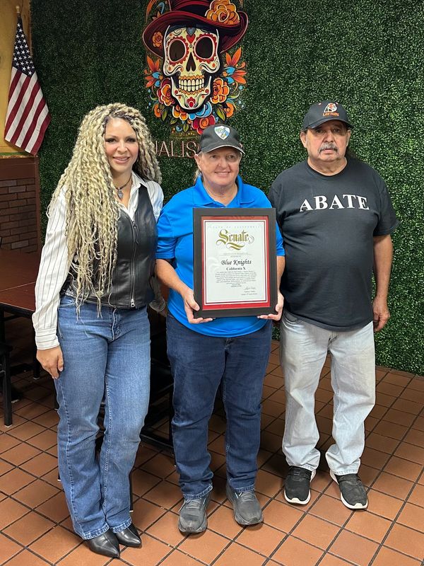 At the ABATE 38 meeting held on September 25, 2025, Blue Knights California X was awarded a Certificate of Recognition from the California State Senate. Pictured accepting the award is CA-X Treasurer Tracey Raybon. The chapter would like to sincerely thank Stephen Padilla, State Senator, District 18, for acknowledging the efforts of our chapter and our ongoing dedication to the community. As we strive to make a difference, this award motivates us to continue moving forward, even during challenging times. The chapter also appreciates its members' tireless efforts to help others while supporting the mission of the Blue Knights organization. Ride with Pride!